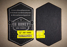 黑卡是名片中的經典,我們則是在這一篇篇經典中書寫關于它們的芳華,一款黑卡我們用異形改變它的傳統版型,采用有色壓凹工藝凸顯黑卡紙張本身的質感,燙銀工藝和外部粘合黃色紙張提升名片在色彩,黑卡低調燙銀高端,整張名片風格穩重而不失時尚感。