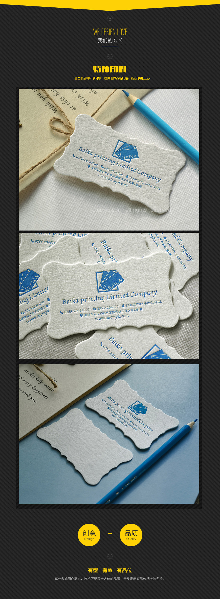 印象中大多數名片以文字為主,而我們要做的是發掘名片的與眾不同,做到文字與圖片相結合同時保持品質例如圖像的清晰度、 文字與圖片的排列,而我們這款名片不僅兼具以上兩個特點,更是采用了高端棉紙,以文字做有色壓凹工藝把名片的美感以及質感 大大的提升了,我們用實力說明美觀與實用性二者可以兼得。
