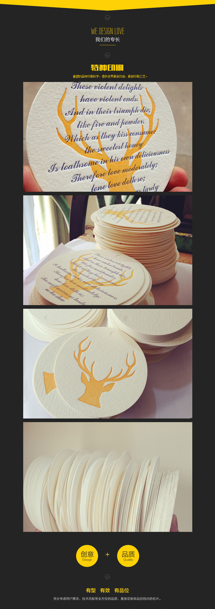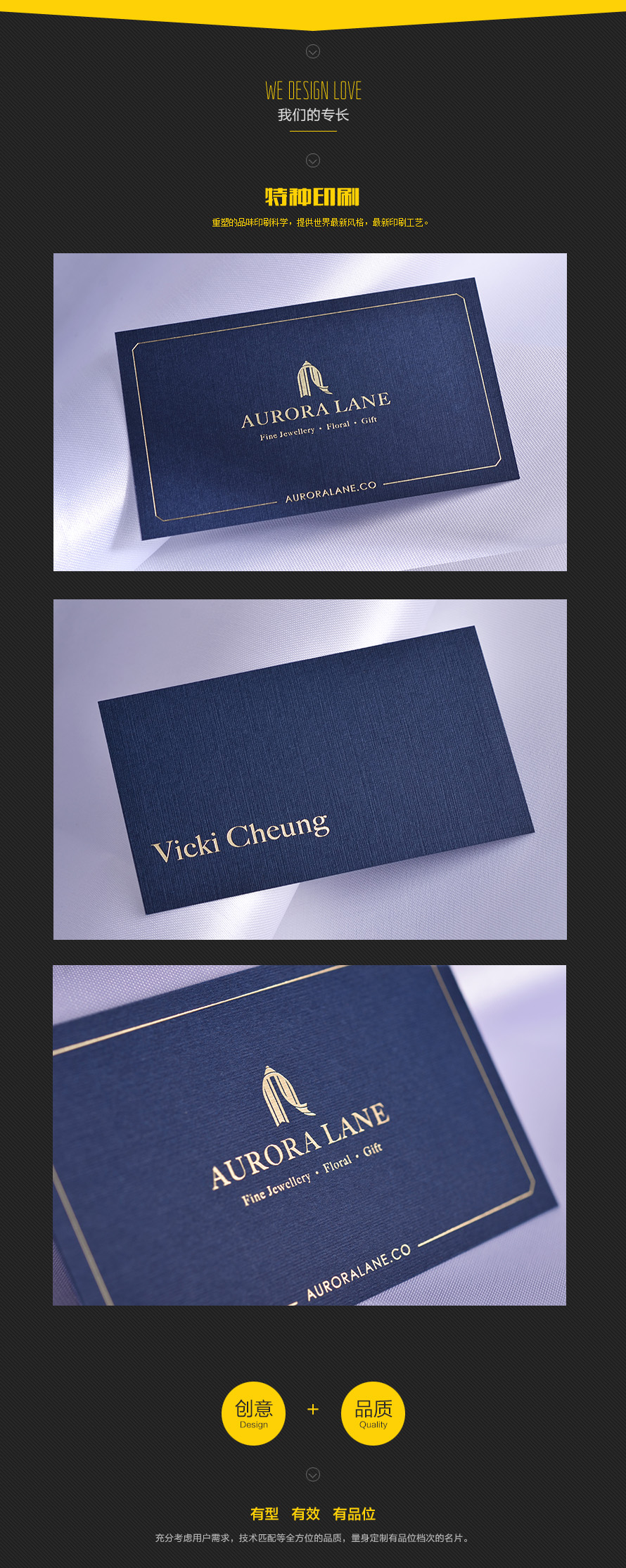 從什么時候開始,名片之于我們不再僅僅是簡單的傳遞信息的工具了,我想大概是我們決定開始把每一張名片用創作來表述而不是簡單粗暴的制作,對名片的每一次創作、創意、創新,都來源于我們對它的專注和熱愛,我們對待每張名片的挑剔、嚴苛,都是我們對這個行業的尊重和期待,我們要做的是給您我的最好!